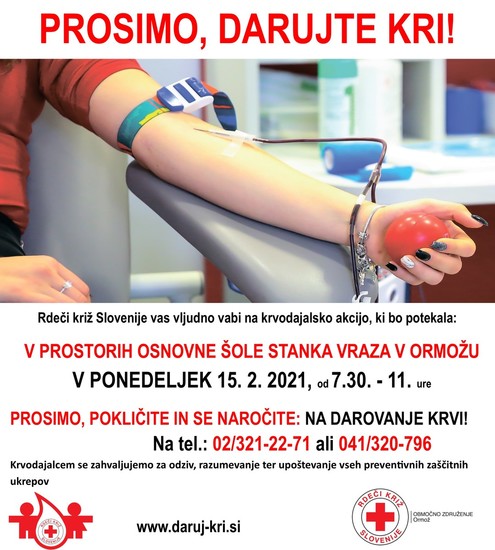 V ponedeljek, 15. februarja 2021, je v prostorih Osnovne šole Stanka Vraza potekala krvodajalska akcija, ki sta je je udeležila 102 krvodajalca. Vsem - krvodajalkam in krvodajalcem - se za njihovo človekoljubno dejanje iskreno zahvaljujemo, zahvaljujemo pa se tudi vodstvu in zaposlenim na Osnovni šoli Stanka Vraza ter VIZ Ormož za njihovo gostoljubje.